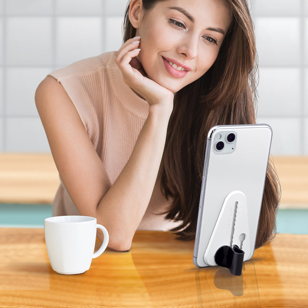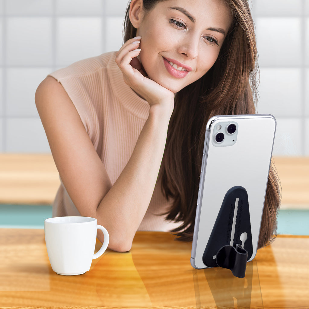 But that's not all - the Wonder Grip® also doubles as a secure vertical and horizontal stand, with four versatile stand positions to choose from. Whether you're watching your favorite shows or following a recipe in the kitchen, the Wonder Grip® has got you covered.