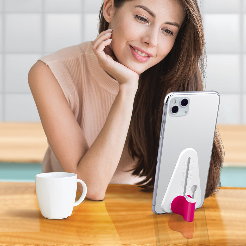 But that's not all - the Wonder Grip® also doubles as a secure vertical and horizontal stand, with four versatile stand positions to choose from. Whether you're watching your favorite shows or following a recipe in the kitchen, the Wonder Grip® has got you covered.